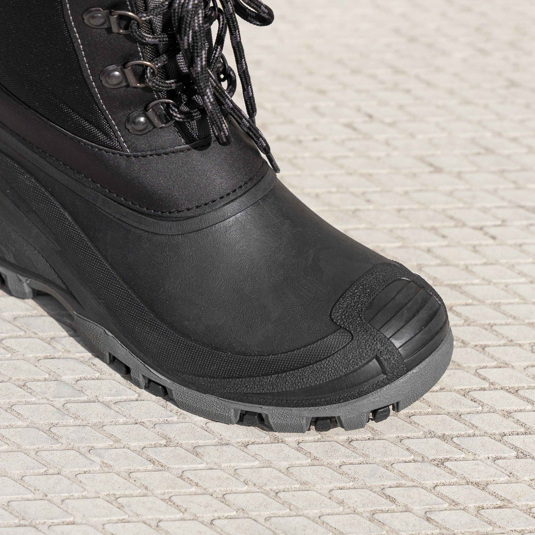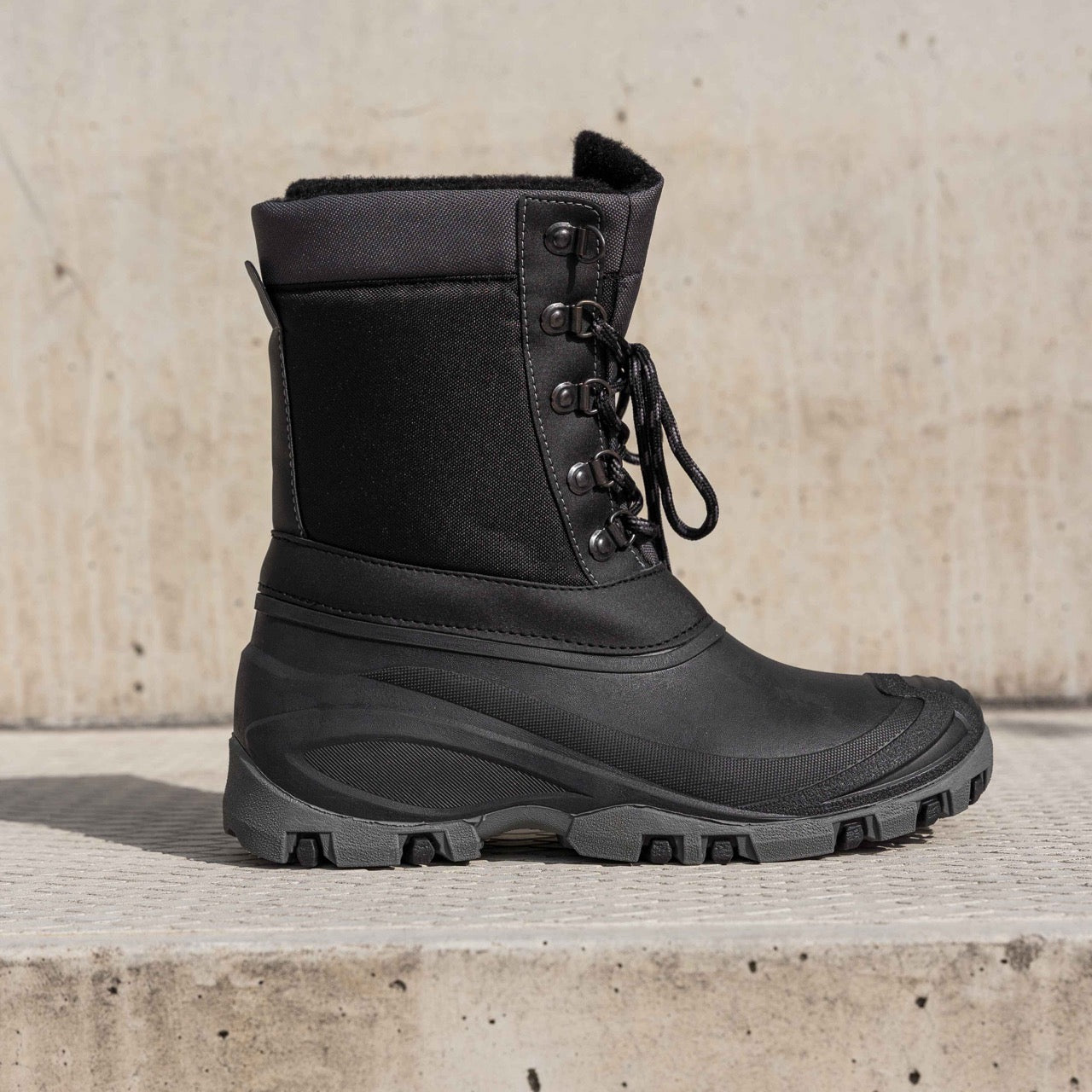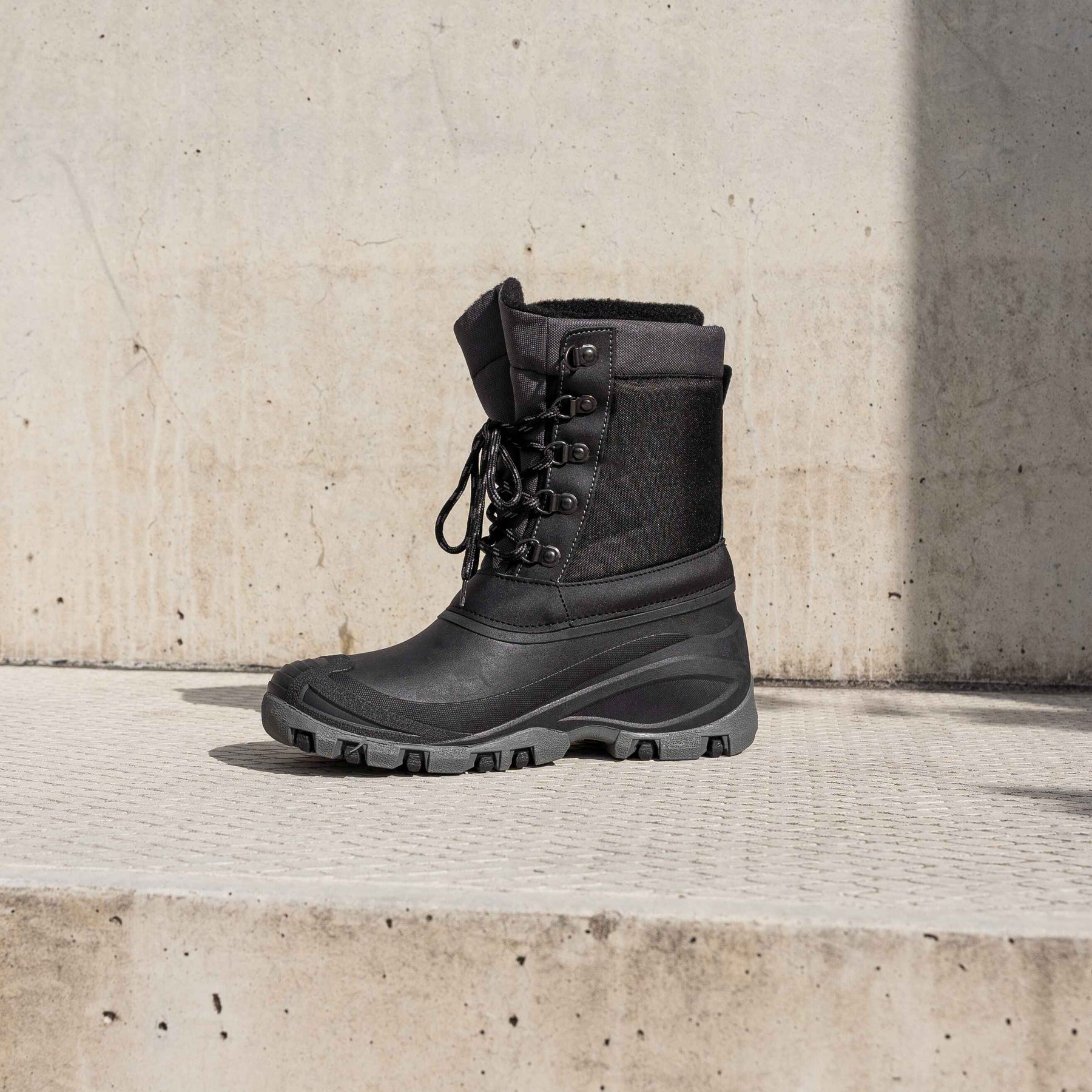 A robusztus kialakítás, kiegészítve a fűzős zárórendszerrel, tartást és stabilitást biztosít a lábnak. A vastag és tapadó szintetikus talp ideális csúszós vagy egyenetlen felületeken.