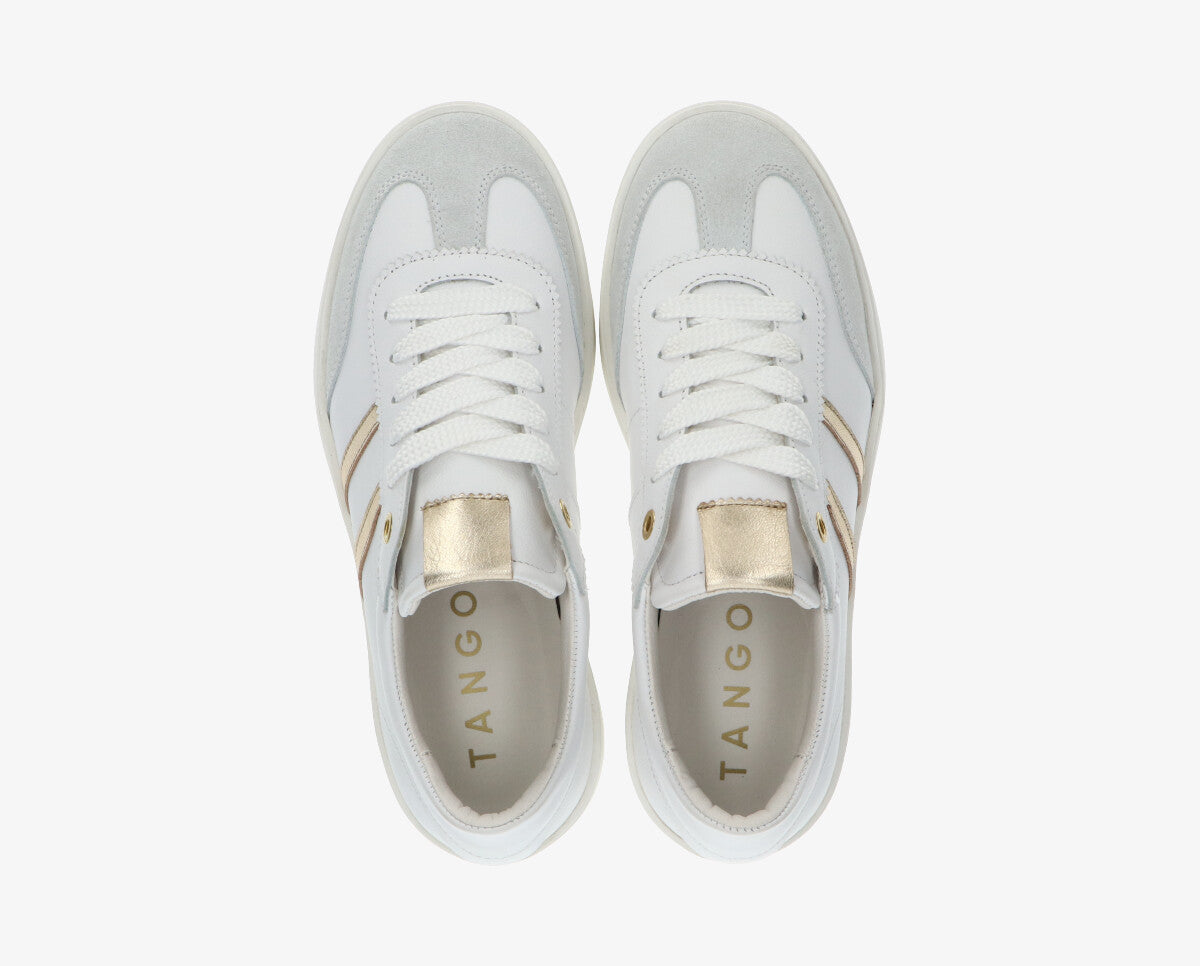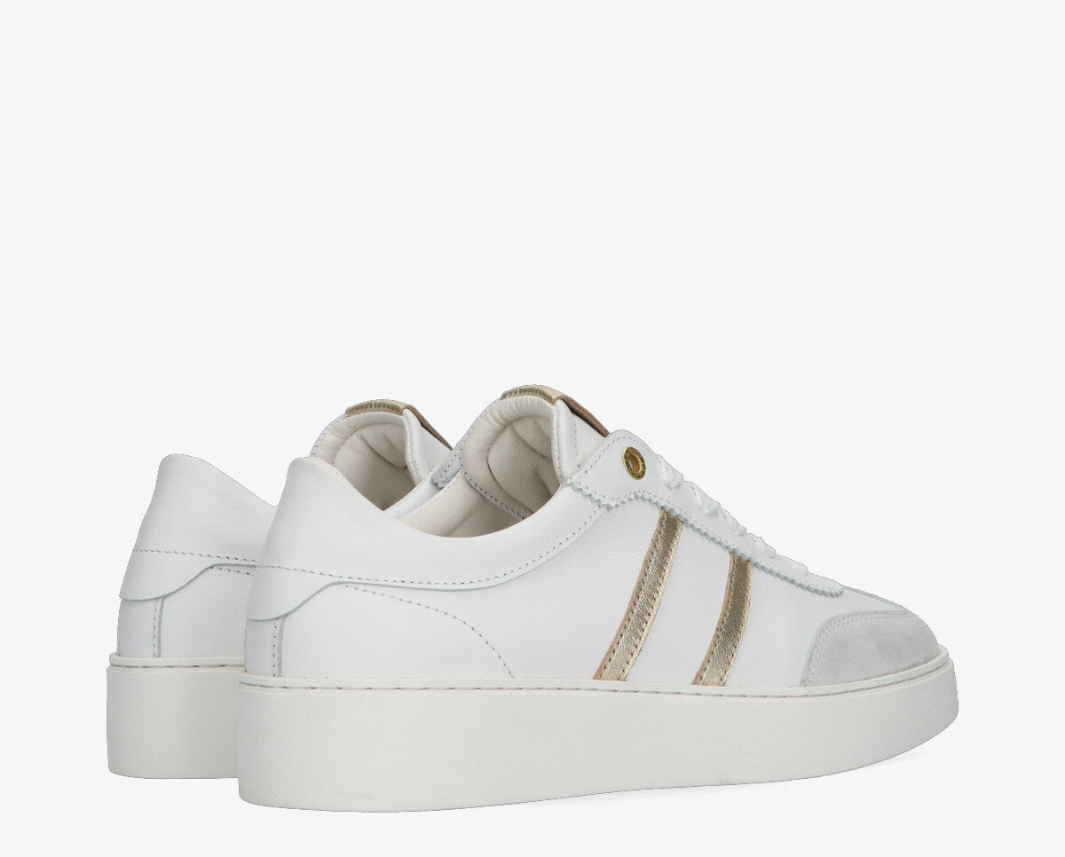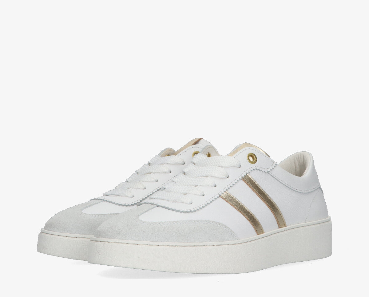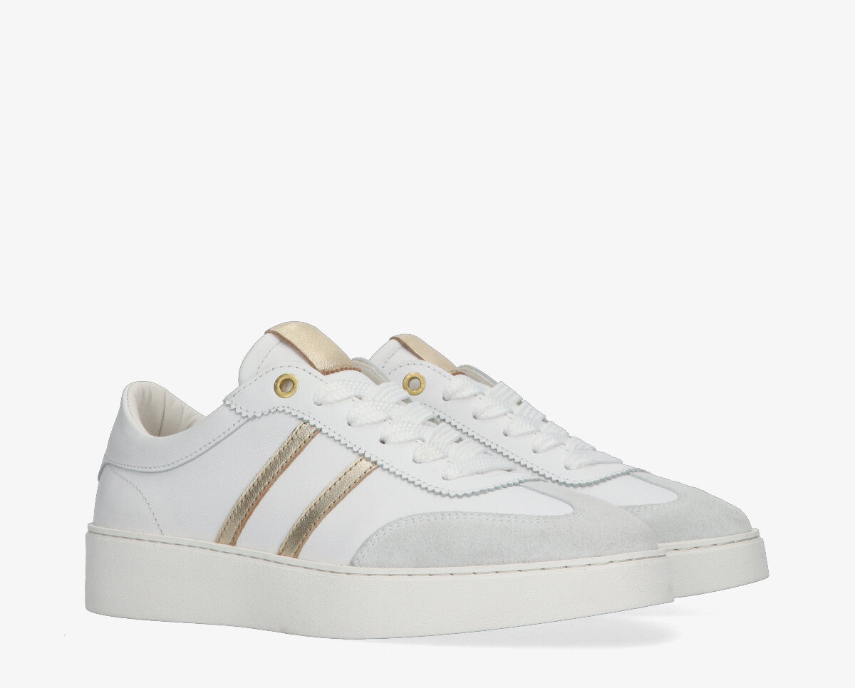 A Nynke sneaker a modern stílus és a mindennapi kényelem tökéletes kombinációja, ideális választás elegáns hangsúlyokkal ellátott alkalmi öltözékekhez. A fehér és arany kombináció friss és kifinomult megjelenést kölcsönöz, könnyen beilleszthető bármilyen ruhatárba.