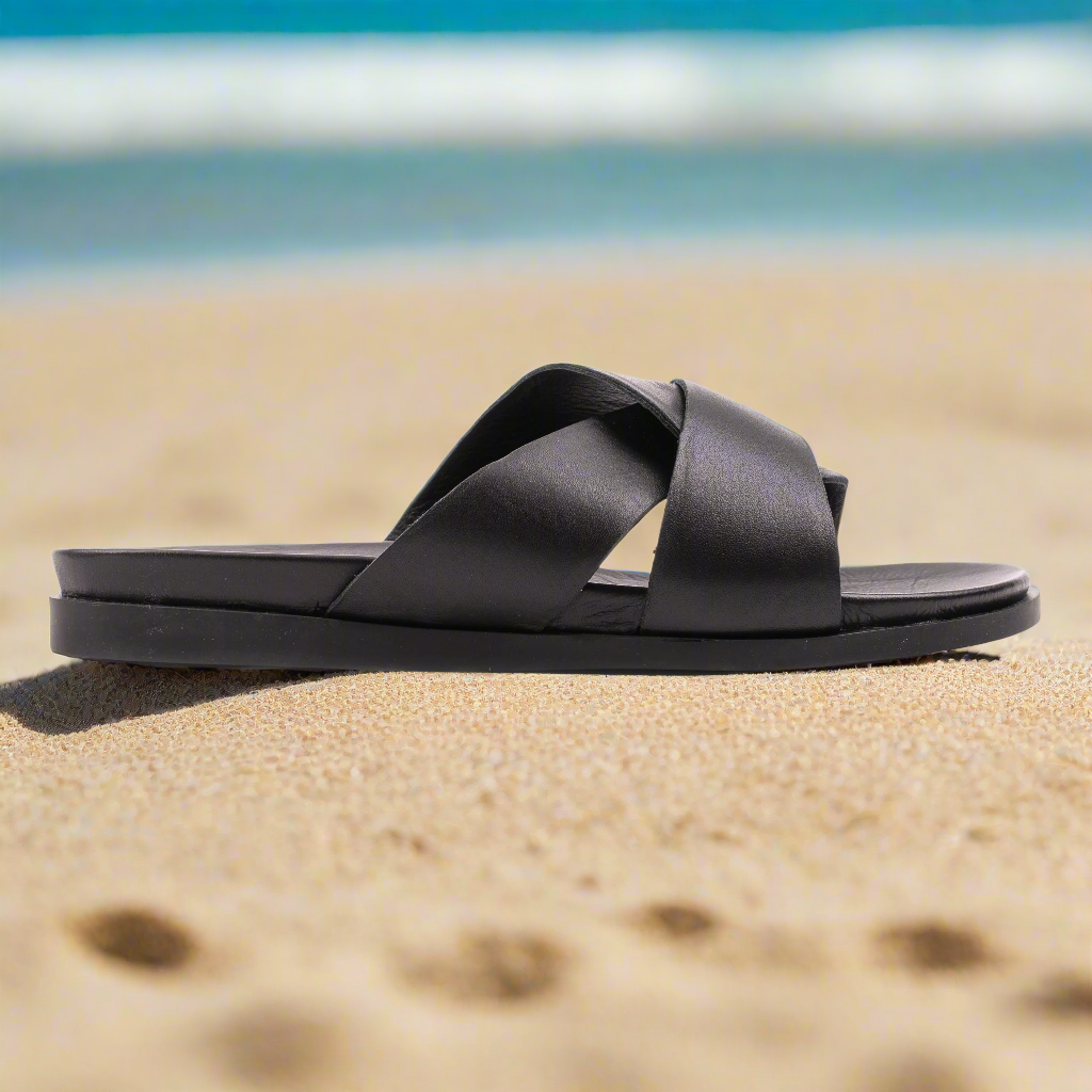 NŐI PAPUCS 402 egy minimalista és modern modell, ideális a meleg évszakra. Az egyszerű dizájn, széles keresztezett pántokkal, elegáns megjelenést biztosít, és könnyen beilleszthető bármilyen nyári ruhatárba.