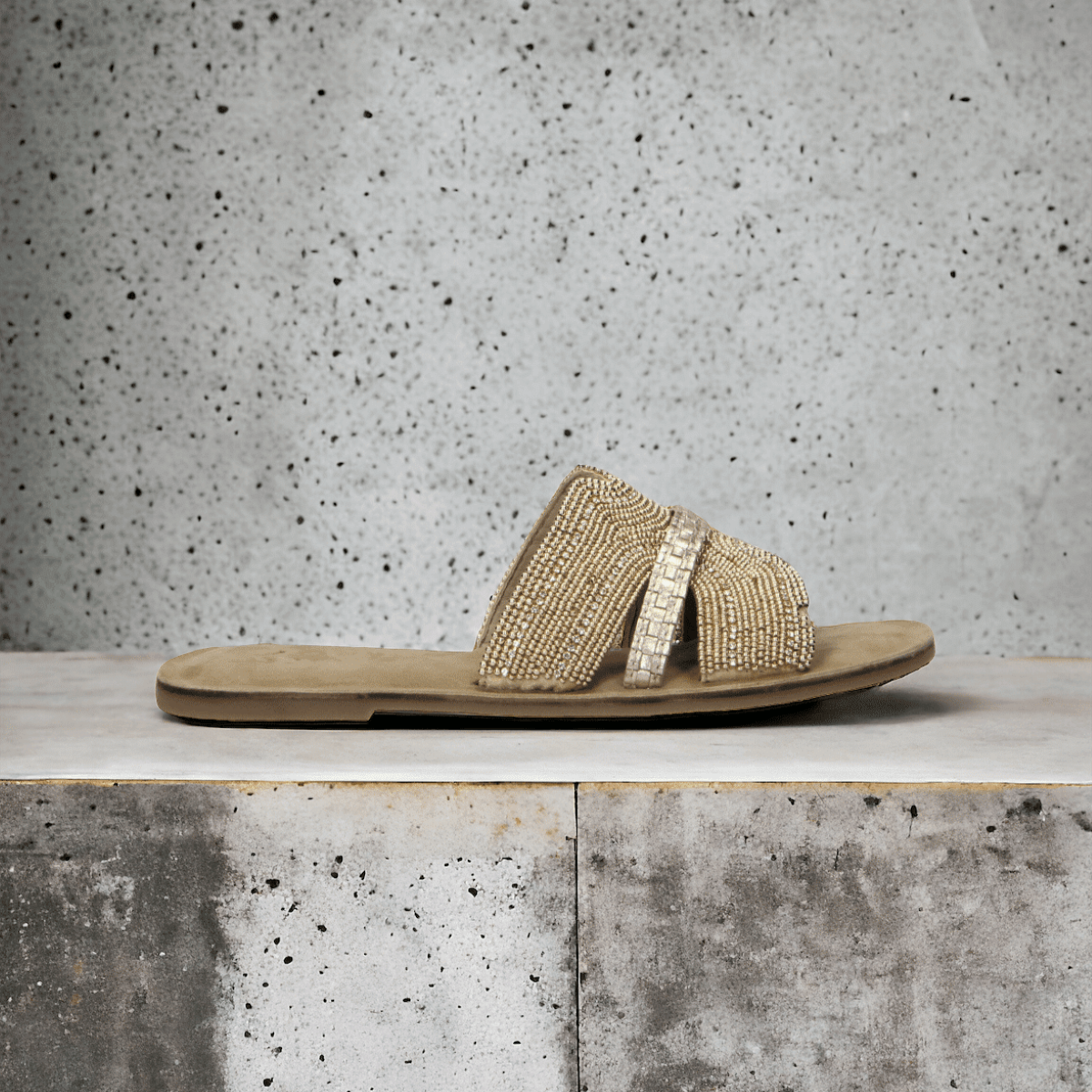 Minőségi textilből készült, csillogó arany színű strasszkövekkel díszítve, ezek a papucsok kifinomult megjelenést és kiváló tartósságot biztosítanak. A strasszos részletek extra eleganciát és sokoldalúságot adnak, könnyedén beilleszthetők esti öltözékekbe vagy ünnepi és különleges alkalmakra.
